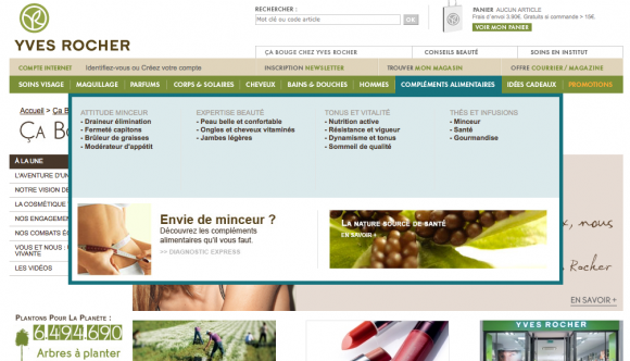 Un beau menu, sobre, avec une bannière promotionnelle qui s'intègre parfaitement dans l'environnement graphique. Le design est très similaire à celui de Yves Rocher, (plus bas dans la liste), au point de se demander qui s'est inspiré de qui ?