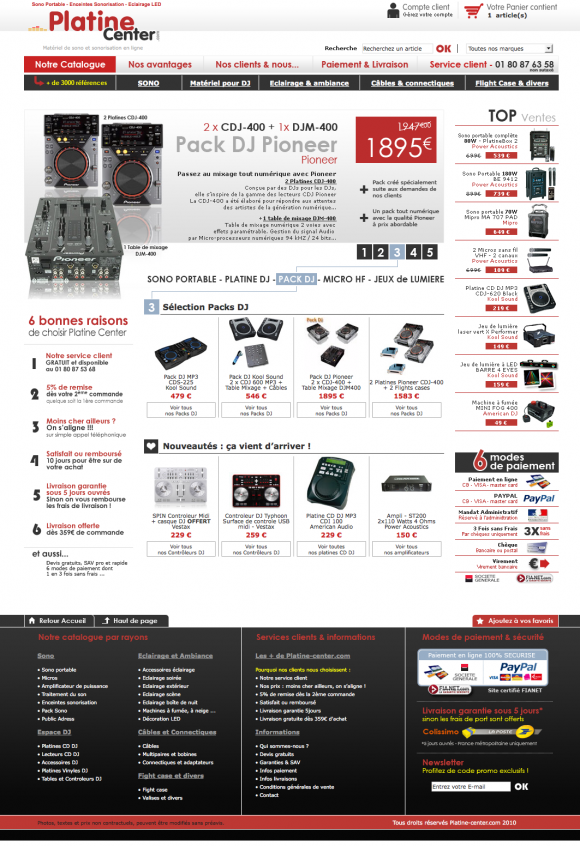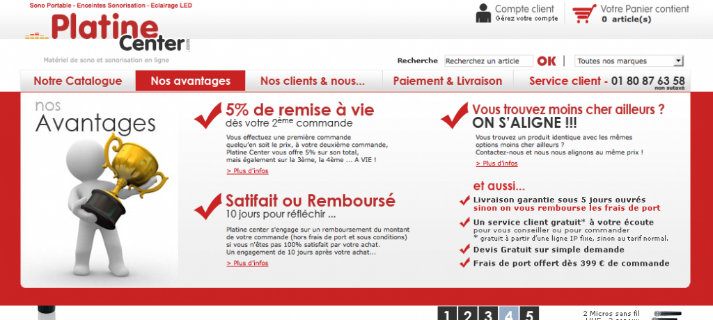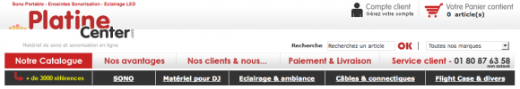 S’il y a un point sur lequel Platine Center met le paquet, c’est la réassurance du client, et de manière ingénieuse. Grâce à une double barre de navigation, la partie supérieure permet d’afficher en survol au passage de la souris tout un argumentaire sur les points essentiels de la relation client : les avantages, le service, le paiement et la livraison, les modes de contact. On ne peut pas être plus transparent, j’ai rarement vu un site aussi clair sur ce point.