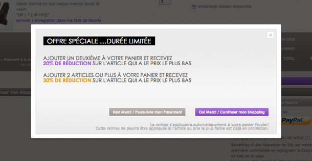Enfin, quand vous validez votre panier, un autre message s'affiche pour vous proposer d'acheter un peu plus et vous permettre de bénéficier d'une belle réduction.